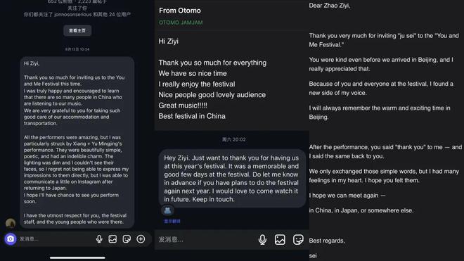 对参演的音乐人而言,“你和我”同样是一次难忘的体验。活动结束后,许多音乐人向赵子毅发来了积极而真诚的反馈,这些都令他深感鼓舞。涩谷浩次不仅在这次演出中收获了全新的体验,也在现场惊喜地发现了自己喜爱的音乐人;大友良英更是称赞“你和我”是“中国最好的音乐节”;FEN乐队成员袁志伟表示,在这里度过的几天令他难以忘怀;而ju sei则告诉赵子毅,正是在这个舞台上,她探索到了自己声音中更多潜在的可能性……