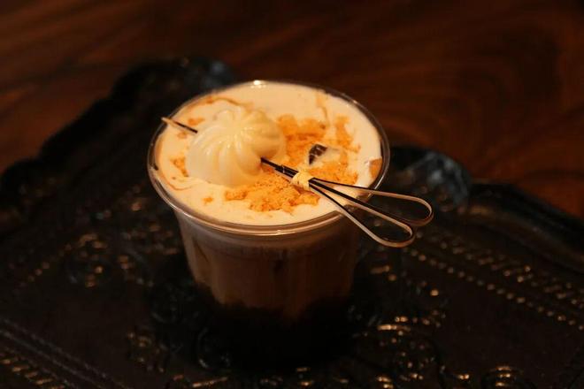 另一款主打产品“砚台摩卡”同样别具匠心。饮品以黑芝麻糊为基底,搭配天然植物萃取的墨色奶油顶,造型酷似一方研磨中的砚台。顶部的食用金色糖箔画龙点睛,灵感来源于“书中自有黄金屋”的千古名句——墨色奶油象征砚中墨,金色糖箔隐喻书中智慧,生动呼应名士居的书香文脉,成为备受年轻人青睐的国潮单品。