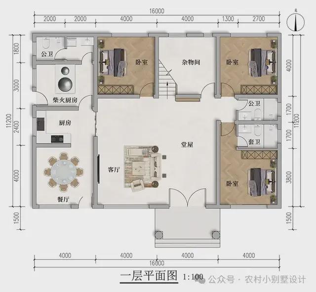 ★入户客厅面积大,占地方正,看着很舒适,并配置旋转楼梯,客厅左边设置2卧室,主卧带内卫,右边设置棋牌室(可以改成厨房),