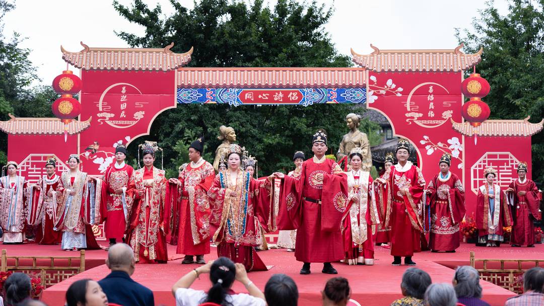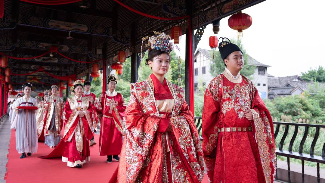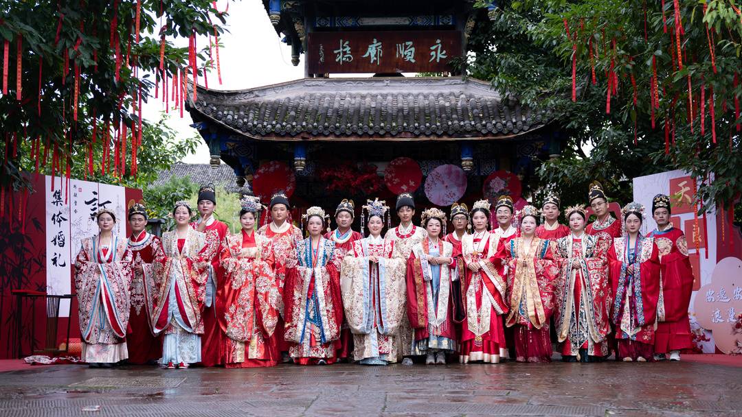 10月1日,国庆佳节首日,黄峨古镇处处洋溢着喜乐氛围,一场别开生面的国潮婚俗秀在此温情启幕。10对“新人”身着精致明代婚服,在古镇的青石板街巷与古朴廊桥间,沉浸式体验了一场兼具传统韵味与仪式感的中式婚仪,为国庆假期增添了浓郁的文化气息。