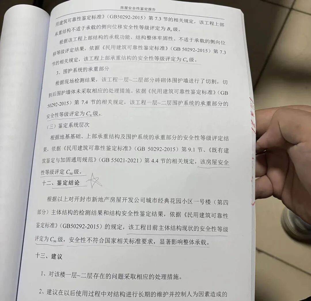 近日,开封市顺河回族区城市经典花园小区1号楼业主向大象新闻·大象帮记者反映称,2025年3月,楼下商铺房东把房子承租给他人改民宿,施工方为了“装修效果”进行违规施工,后经专业机构鉴定,整栋楼房评定为Csu级危房,已经对楼上28户业主造成安全威胁。